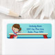 Dieses niedliche Girls Gymnastik Rücksendelabel besticht durch ein hübsches brünettes Gymnastikmädchen, das vor einem Strahl stehend ist. Sie trägt einen roten Leotard und lächelt neben ihrer Adresse in schönem Blau.