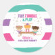Dreh, Tumble und spiele! Gymnastik Geburtstagsaufkleber in Rosa, lila und Türkis.