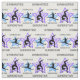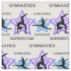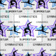 Mädchen Gymnastik Superstar Stoff. Mit lila und blauen Sternen und einer Silhouette im Gymnast, die einen Sprung und einen Rücken-Walkover macht.