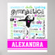 Gymnastik Typografie Poater. Viele Gymnastikworte umgeben diesen zauberhaften Gymnast. Es hat dekorative Sterne und ein benutzerdefiniertes Textfeld, damit Sie Ihren eigenen Namen hinzufügen können! Die Farben sind in Rosa, Blau und Grün hell, um das Schwarze zu akzentuieren. ©gollygirls.com