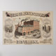 Eine erhöhte Aussicht auf die Gebäude der Brennerei H.& H. Reiners in Brooklyn, New York, zeigt Fußgänger und Likörfässer in einem von Pferden gezeichnet Wagen an der Kopfsteinpflasterstraße vorne. Das vierstöckige Gebäude aus Ziegelstein ist mit der Bezeichnung 1879 und HR versehen, und das zweistöckige Gebäude hat Türmarken mit der Aufschrift Office, 177 und 179 und ein Schild an der Seitenwand, das H & H Reiners Distillery Rectiifying [sic] House Alle Arten von Spirits Alcohol lautet. Zwei seitliche Vignetten in ovalen Rahmen zeigen den Innenausblick der Einzelhandelsabteilung, zeigen eine Frau und ein Kind an der Theke in einem großen Lagerraum, und die Stillräume zeigen die Brennerei-Ausrüstung. Circa 1879