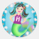 Eine niedliche kleine Meerjungfrau mit einem großen "H" auf ihrem Shirt, umgeben von einem Ring aus Muscheln und Seestern.