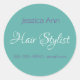 Ein trendiger Rundaufkleber, um Ihren Haar Stylist Beruf oder jeden Beruf auf aquamarinem Hintergrund mit weißer und lila Schrift zu fördern. Personalisieren Sie Ihre Daten mit Namen, Telefon und E-Mail. Ideal zum Versiegeln von Umschlägen oder überall, wo Sie einen Aufkleber benötigen.