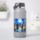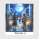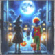Beängstigende Halloween-Aufkleber mit Luftkunst, die ein kleines Junge und Mädchen in einem Clown und Hexenkostüm darstellen, die aus dem Haus laufen, um am Ende ihres Bürgersteigs einem beängstigenden Monster zu begegnen.