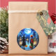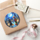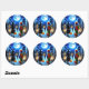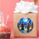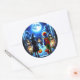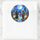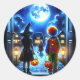 Beängstigende Halloween-Aufkleber mit Luftkunst, die ein kleines Junge und Mädchen in einem Clown und Hexenkostüm darstellen, die aus dem Haus laufen, um am Ende ihres Bürgersteigs einem beängstigenden Monster zu begegnen.