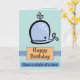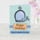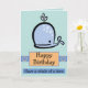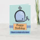 Eine schöne Geburtstagskarte mit einem glücklichen Blauen Cartoon mit Wasser, das von seinem Luftloch auf blauem Hintergrund sprießt. Unten sind die Wörter glücklicher Geburtstag in schwarzem Text in einem orangefarbenen Kasten. Unten ist eine blaue Box mit "Have a Whale Of A Time" auch in schwarzem Text. Eine Vorlage befindet sich in der Karte, um Ihre eigene Geburtstagsnachricht hinzuzufügen, wenn Sie möchten.