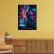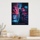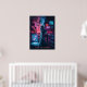 Thema: Futuristische, dystopische Welt inspiriert durch Cyberpunk-Spiele. Central Image: Eine Figur im Cyberpunk-Stil mit High-Tech-Ausrüstung und holografischer Schnittstelle. Hintergrund: Futuristische Stadt mit Neonlicht, fliegenden Autos und digitalen Bildschirmen. Text: "Hack the System" Farben: Neon blau, lila, rot und schwarz.