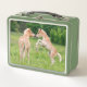 Zwei niedliche Haflinger Fohlen haben Spaß, Aufzucht und Frosch auf einer Wiese. Das blonde Flaxenkastanienpferd, auch Haffiden oder Veligne genannt. Foto von Katho Menden aufgenommen. Diese Metal-Lunchbox ist eine bezaubernde Geschenkidee für Pferdefreunde.