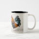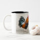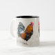 Tasse mit Bild von zwei stolzen Hähnen, die sich gegenüberstellen (widergespiegeltes Bild des gleichen Hahns).