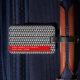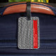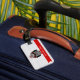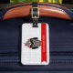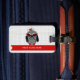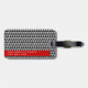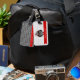 Ein Gepäckumbau, der eine Illustration einer grauen und schwarzen Eule mit einem Hahnentrittmusterbauch und roten Füßen kennzeichnet. Eule trägt einen roten und schwarzen fascinator Hut und rote eine Katzenaugen-Sonnenbrille. Gegenüberliegende Seite ist Hahnentrittmuster. Personifizieren Sie den Text auf beiden Seiten.