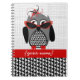 Ein gewundenes Notizbuch, das eine Illustration einer grauen und schwarzen Eule mit einem Hahnentrittmusterbauch und roten Füßen kennzeichnet. Eule trägt einen roten und schwarzen fascinator Hut und rote eine Katzenaugen-Sonnenbrille. Personifizieren Sie mit Ihrem Namen.