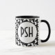 Eine Tasse, die einen festen schwarzen Hahnentrittmusterentwurf kennzeichnet. Kennzeichnet ein Kreis geformtes Rahmenespritmonogramm nach innen.