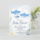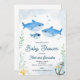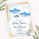 Baby Dusche Einladung mit zwei Minuten. Diese Babydusche lädt zu Aquarellbildern ein, die von Hand gemalt werden, zwei Mami-Haie, ein kleiner Babyhai und unter den Meereselementen. Ideal für ein Party mit Wassermassage. Ein Teil des Textes kann bearbeitet werden.