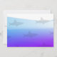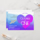 Eine Einladung zum ersten Geburtstagsfest zum Thema Hai. Ein kleiner Haicharakter betrachtet ein lila rosa Herz, das aus ihm Stiche gezogen hat.