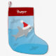 Ein Weihnachtsweihnachtsweih mit einem lächelnden Hai in einer Weihnachtsmannmütze und einem anpassbaren Namen auf blauem Meeresgrund. Fügen Sie einfach Ihren speziellen Namen hinzu, fügen Sie diesen Strumpf in Ihren Warenkorb und haben Sie eine haarktakuläre Weihnachten! Shark Weihnachtsmannmütze Ocean Fun Tier Kleine Weihnachtsfeiertage Strumpf Design | ©Melissa Patton - Künstler/Illustrator