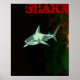Coole Illustration über Haie für Ihre Wände. Das Bild eines Haifischfisch und ein schwarzer Grunge Hintergrund mit dem Wort "SHARK" in einem roten Schriftart