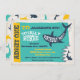 Hier ist das Ticket für einen Spaß und grafische Hai Geburtstag Pool Party Einladungen. Ein Hai mit einem großen Biss, der aus dem Ticket genommen wird. Leichte grungy Imitate Leinenunterlage.