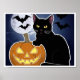 Das Design zeigt eine schwarze Katze, die neben einem geschnitzten Kürbis mit einem lächelnden Gesicht sitzt. Der Hintergrund umfasst einen Nachthimmel mit Vollmond und mehreren fliegenden Fledermäusen. Das Bild repräsentiert vermutlich Halloween-Themen, da die schwarze Katze oft mit Aberglaube und Feiertag verbunden ist, und die Jack-o’-Laterne, eine häufige Halloween-Dekoration. Der Vollmond trägt zur unheimlichen Atmosphäre bei, die typisch für Halloween-Feiern ist.