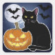 Das Design ist eine stilisierte Abbildung mit einer schwarzen Katze und einer Jack-o’-Laterne unter Vollmond mit Fledermäusen im Hintergrund.Halloween Night Pats