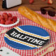 Dieses sportliche, sportliche Design zeichnet sich durch feinen HALFTIME-Text in einem hervorgehobenen, schwarzen, breiten Mittelstreifen mit weißen und gelben Rennstreifen gegen tiefe blaue Außenstreifen aus. Der Text kann personalisiert sein.