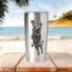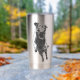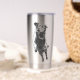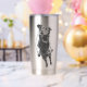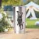 A Labrador lifts into a dotted midair arc, ball secure and focused. Black-and-white balance keeps mornings bright and playful without clutter. Simple joy for dog people.