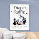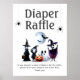 Halloween Babyduschplakat für die Windelverlosung. Niedliches Design mit Skeletten, Gespenstern, Kürbissen und Spinnen in Grautönen, Schwarz und Weiß. Man legt ihn so, dass er für den zeichn auf den Tisch gestellt wird oder an einer Wand hängt.