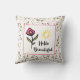 Ein Kissen mit einem quadratischen Rahmen und einem rosa Rahmen, im Inneren steht "Hello Beautiful", geschrieben in einem trendigen Schriftart mit einer gelben Sonne über dem Text. Auch eine hübsche, rosa, lange Blume mit grünen Blätter an der Seite. Die Kulisse ist ein nahtloses Muster mit handgezeichneten, rosa Wildblumen mit langen grünen Stielen und Blätter auf einem eggshell weißen Hintergrund. Auch rosa Kreise und Zierleisten schmücken das Design. Niedliches und hübsches Blumendesign.