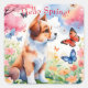 Aquarellmalerei eines bezaubernden Hundes, umgeben von Blume und Schmetterlingen.