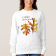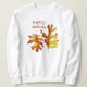 Herbst lässt Sweatshirt mit Tinte und Aquarellbild, die zwei bräunlich-gelbe Button Eiche Blätter und den Text Hallo Herbst. Eines der Blätter hat eine geschwungene Seite, die wie eine Hand aussieht, die es seinem Tanzpartner gibt.