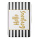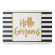 Schöne moderne trendige Schrift-Schrift-Schrift zitieren. "Hallo Gorgeous". Mit einem hübschen vergoldeten Rahmen aus metallischem Glitzer und goldenen Buchstaben mit schwarz-weißen Streifen.