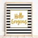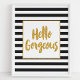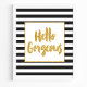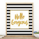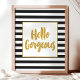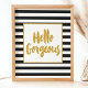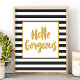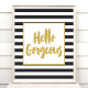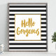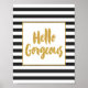 Schöne moderne trendige Schrift-Schrift-Schrift zitieren. "Hallo Gorgeous". Mit einem hübschen vergoldeten Rahmen aus metallischem Glitzer und goldenen Buchstaben mit schwarz-weißen Streifen.