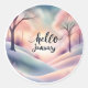 Hallo Januar, mit pastellfarbenen Farben in einer ruhigen schneebedeckten Landschaft, die die ruhige Schönheit des neuen Jahres einfangen. Ein perfektes Design, um die friedliche Atmosphäre des Winters zu genießen!