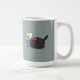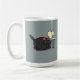 Eine niedliche schwarze Katze mit einer Kaffeetasse und einem Herz