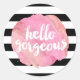 Mit diesen hübschen Aufklebern können Sie Ihre Karten mit Stil, Einladungen und Korrespondenz versehen. Das Design zeichnet sich durch einen schwarz-weißen Streifen-Hintergrund aus, der in einem rosa Wasserfarbenblock mit "Hello Gorgeous" beschriftet ist.