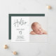 Eine moderne, einfache und elegante Schrift hallo typografie Baby Geburtsankündigung mit 1 Foto Gitter Collage, und eine elegante Typografie Kalligraphie, mit hallo Babyname. Das Baby vorstellen! Die dunkelgrüne Hintergrundfarbe ist vollständig editierbar.