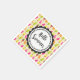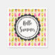 Papierservietten mit dem Bild eines sommerlichen Musters von Popsikeln und Eis in Aquarellfarben. Hallo Sommer geschrieben in einem lustigen trendigen Schriftart in einem runden whimsical Rahmen.