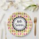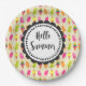 Papier Teller mit einem Bild von einem sommerlichen Muster von Popsikeln und Eis in Wasserfarben. Hallo Sommer geschrieben in einem lustigen trendigen Schriftart in einem runden whimsical Rahmen.