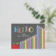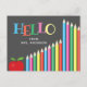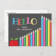 Diese Postkarte ist eine farbenfrohe Art, sich mit Ihren Schülern zu verbinden. Das Design bietet eine KalkTafel mit farbigen Stiften und einem roten Apfel. Der farbige Text lautet: "Hallo" aus dem Namen des Lehrers.