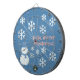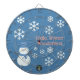 Ein Slice of Life and Delight präsentiert ein Wonderland-Dartboard mit einem Schneemann, der mit weißen Schneeflocken, rosa Schrift und einer blauen Kulisse dekoriert ist. Das Dart-Board des Schneemanns verfügt auch über einen blauen Hut und Schal.