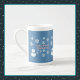 Ein Slice of Life and Delight präsentiert Hallo, Winter Wonderland Espresso, Knochen-China und Jumbo-Tasse mit einem Schneemann mit weißen Schneeflocken, rosa Schrift und einer blauen Kulisse. Die Schneemann-Tasse haben auch einen blauen Hut und Schal.