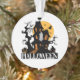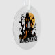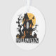 Halloween, komm in die spuke Stimmung. Ein kurioses Halloween-Szenario entfaltet sich mit einer Silhouette eines Spuk Hauses vor dem Hintergrund eines hellen orangefarbenen Mondes. Das Haus mit seinen unheilvollen Fenstern und einer im Freien schwebenden Figur ist groß und geheimnisvoll. Zwei nackte Bäume, deren Äste sich wie skelettartige Finger ausstrecken, umrahmen das Haus und tragen so zur unheimlichen Atmosphäre bei. Im Vordergrund sitzt ein geschnitzter Kürbis mit einem finsteren Grinsen, der eine Touch verspielten Horrors hinzufügt. Das Wort "HALLOWEEN" ist über den Grund verziert, mit Spinnennetzen, die den sprichwörtlichen Charme des Urlaubs darstellen.