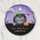Genießen Sie diese leckeren Halloween Baby Dusche Lieblings-Anhänger für Ihr Baby ist das Brewing Thema Babydusche. Das Design umfasst einen lila Nachthimmel mit unheimlichen Bäumen, Vollmond, einen Kessel mit Fledermäusen, Kürbis und einen Schädel.