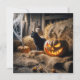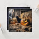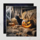 Eine schwarze Katze sitzt neben einem glühenden, geschnitzten Kürbis mit einem unheimlichen Gesicht, das eine unheimliche Atmosphäre schafft. Alle Texte können geändert werden.