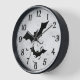 Das ist ein Design für die Halloween-Saison mit schwarzen, grafischen Fledermäusen, die über einem weißen Grunge-Hintergrund fliegen. Es gibt eine Uhr Gesicht mit schwarzen Zahlen in einem dünnen schwarzen Ring umkreist. Dieses Design schafft eine einzigartige Wanduhr für Ihren Zuhause oder Ihr Büro.