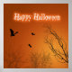 Eine Silhouette Halloween-Illustration: Spooky Schwarze Fledermäuse und gruselige Bäume mit einem trickreichen "Happy Halloween" Gruß auf einem mystischen Hintergrund.