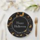 Die Papiertafel aus Halloween-Party wird mit einem festlichen Fledermausdruck gezeigt. Passen Sie dieses Objekt an oder kaufen Sie, wie es ist. In 9" Größe angezeigt. Verkauft in Paket mit acht.