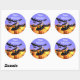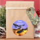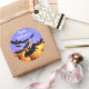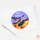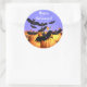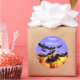 Vergnügungs-Aufkleber mit meinem Original-Kunstwerk von Fledermäusen, die aus Kürbissen fliegen, unter Vollmond. Der Text sagt "Happy Halloween!"