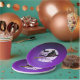 Dieses Halloween-Design zeigt eine schwarze Katze mit einem Hexenhut, der nachts auf einem Hexenbesen, umgeben von Fledermäusen vor Vollmond, fliegt und ein Sprichwort "Happy Halloween".