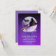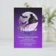 Diese Einladung enthält eine schwarze Katze mit einem Hexenhut, der in der Nacht auf einem Hexenbesen fliegt, umgeben von Fledermäusen vor Vollmond.