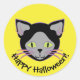 Dieser runde Aufkleber ist perfekt für Halloween-Party-Favoriten oder Leckereien geeignet und bietet eine lustige schwarze Katzengrafik und ist leicht zu verändern.